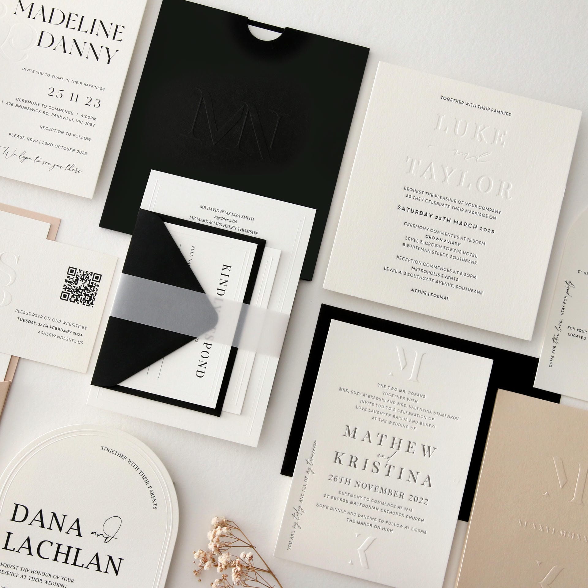 Our award-winning team works one-on-one with you to create bespoke invitations that reflect your personality, your style, and your celebration – crafted from scratch with unlimited revisions until they’re absolutely perfect.